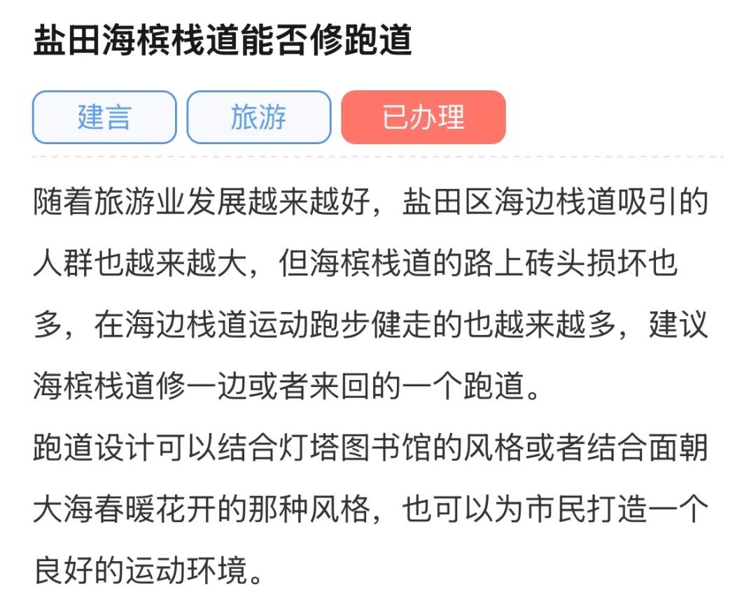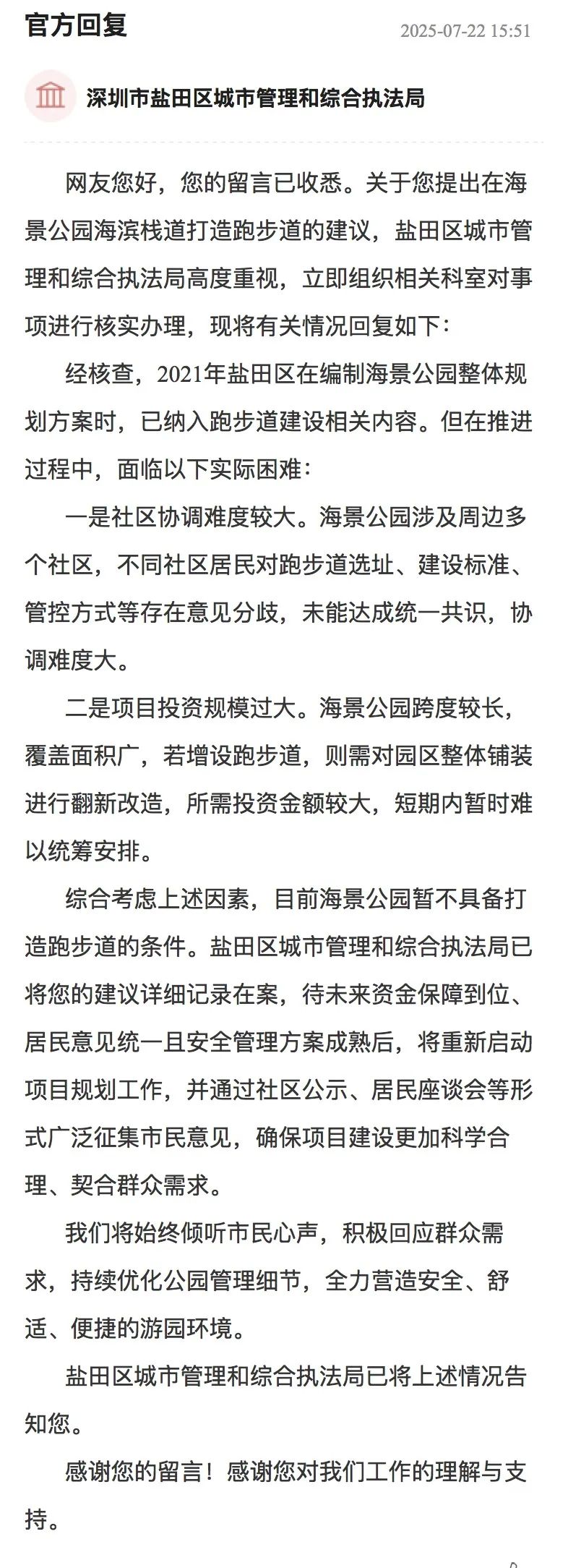 ● 深圳网友建议盐田海滨栈道修建跑道,官方回应:海景公园暂不具备打造跑步道的条件。