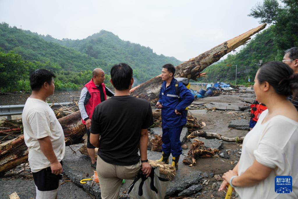 7月27日,在北京市密云区石城镇西湾子村,密云区消防救援支队溪翁庄消防站消防员在徒步前往通讯中断的黄峪口村途中与附近村民交流。