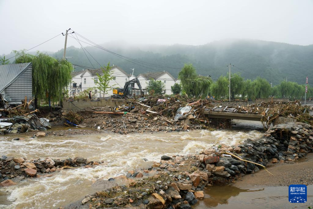 7月27日,在北京市密云区石城镇西湾子村,救援人员清理被杂物阻断的桥梁。