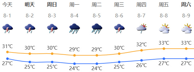 深圳今日阴天间多云,有(雷)阵雨,部分时间雨势较大,局地可达暴雨;气温27-31℃;西南风3级;相对湿度70%-95%。