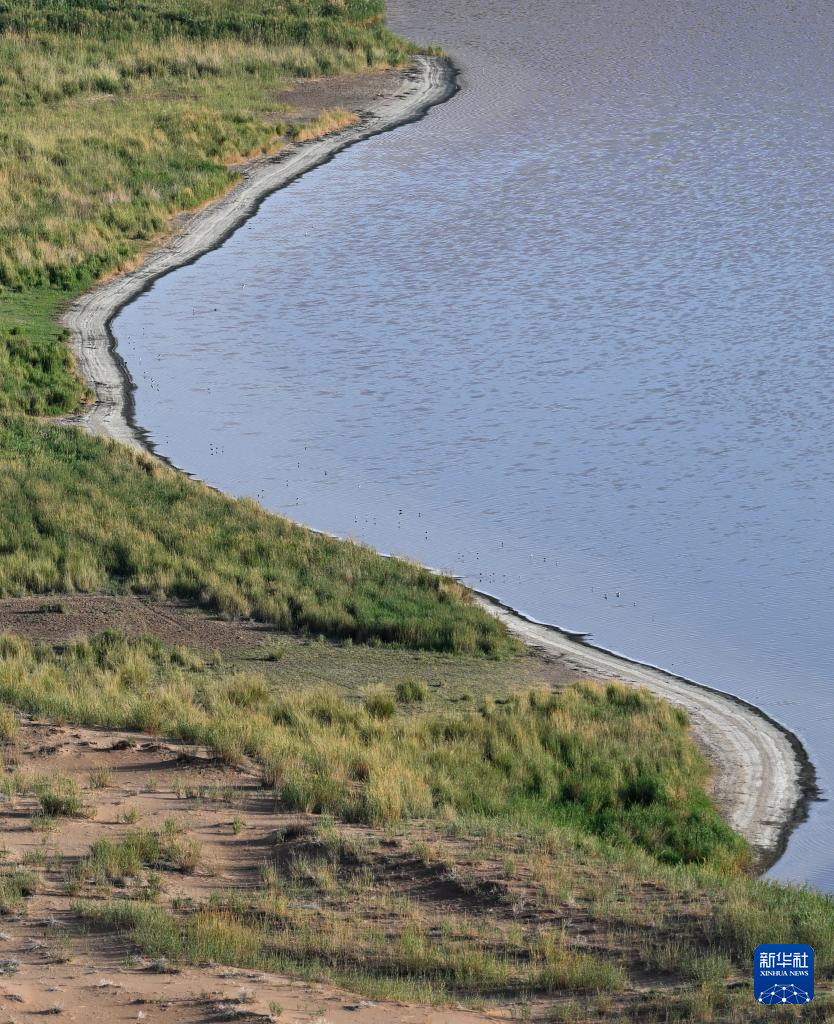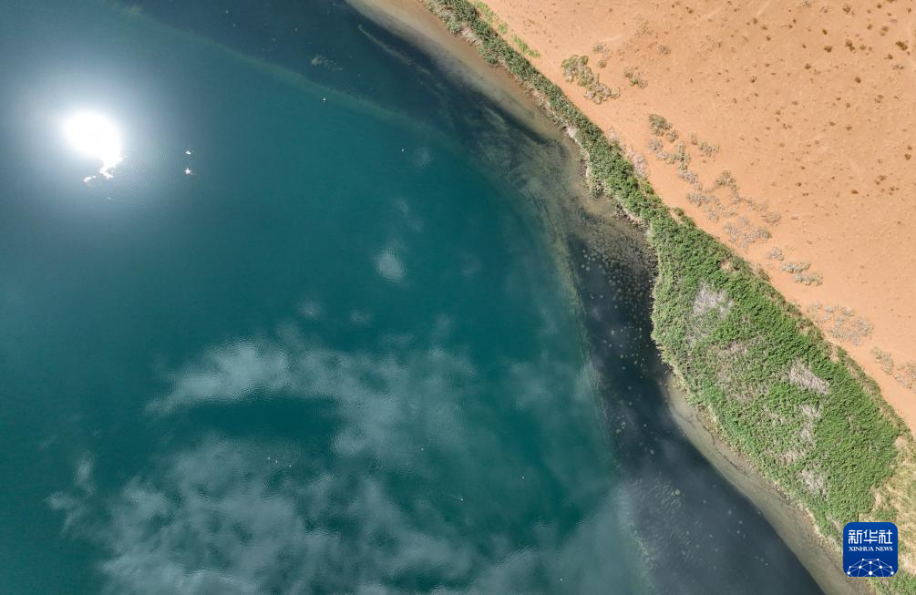2024年7月30日在内蒙古阿拉善盟阿拉善右旗拍摄的巴丹吉林沙漠中的湖泊(无人机照片)。新华社记者 贝赫 摄