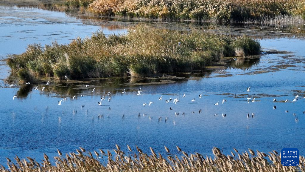 2024年10月14日在内蒙古阿拉善盟额济纳旗拍摄的居延海景区(无人机照片)。新华社记者 贝赫 摄