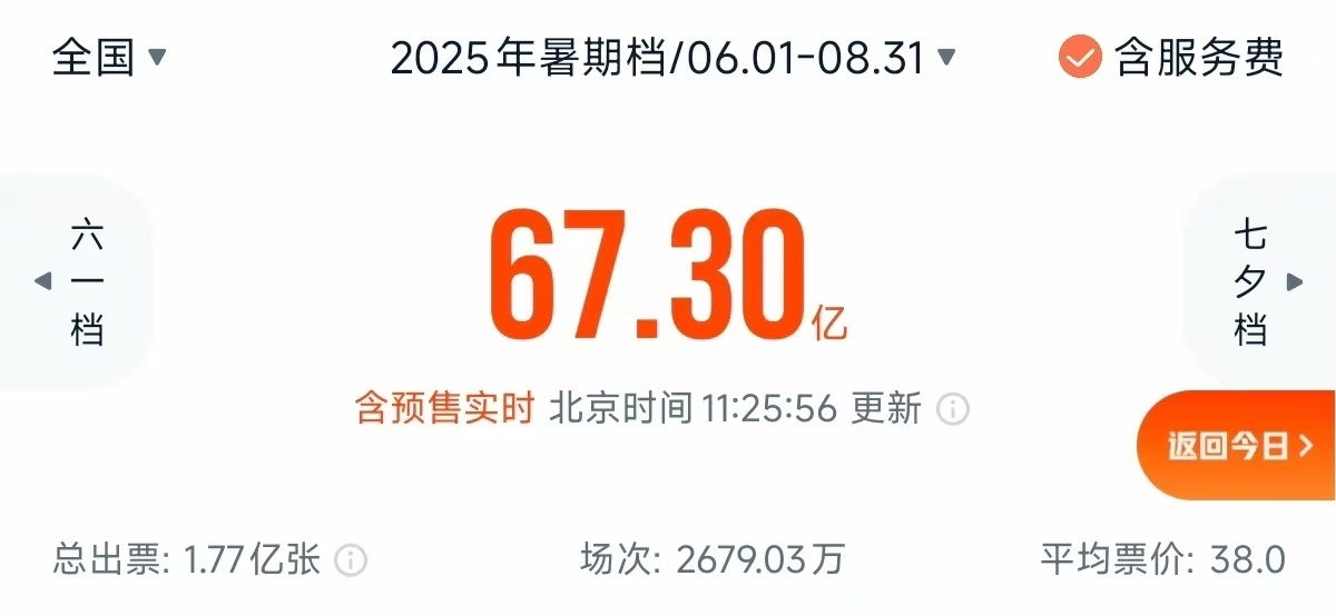电影总票房(含预售)已突破67亿元