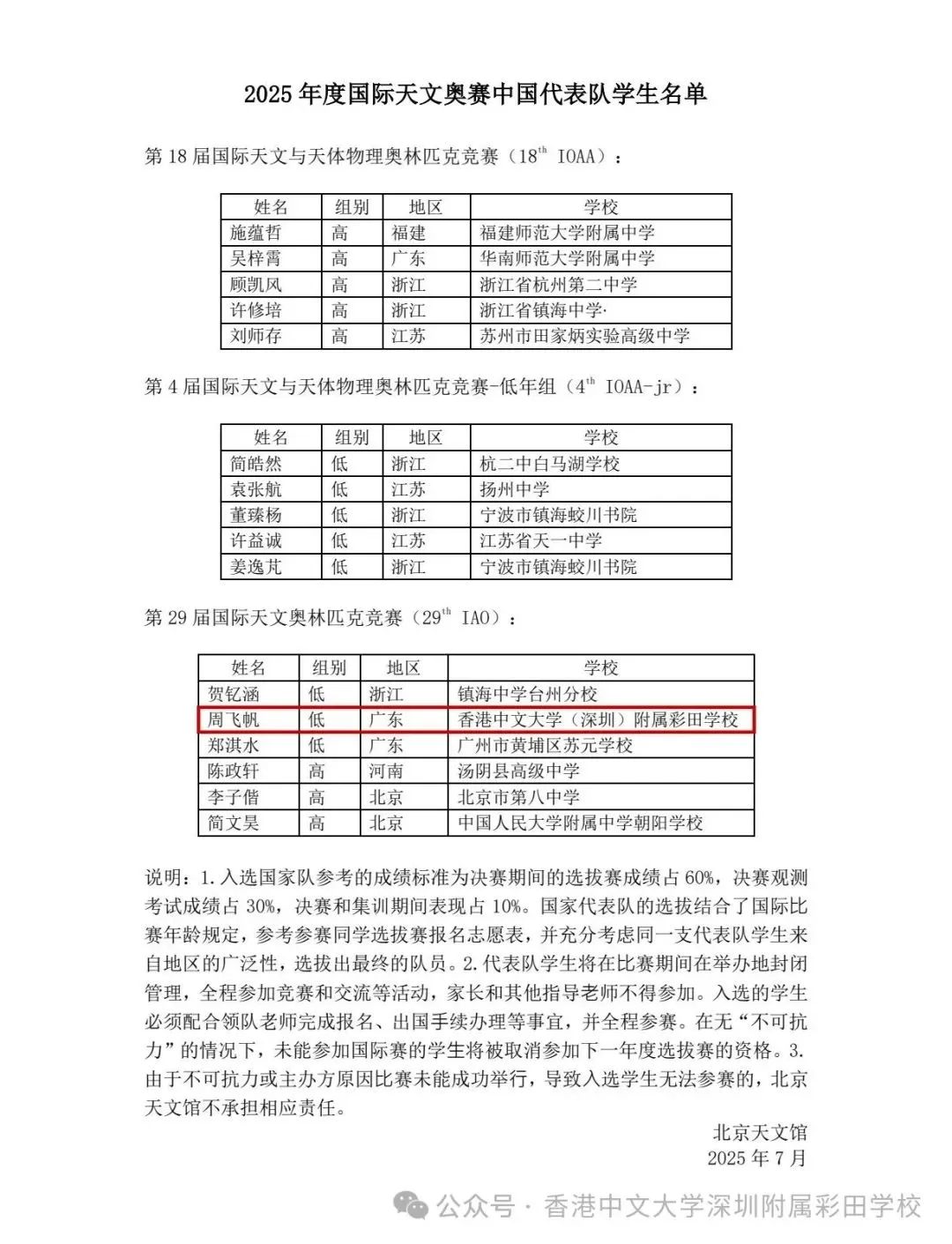 ● 近日,北京天文馆正式公布入选2025年度国际天文奥赛中国代表队学生名单,其中包括来自香港中文大学(深圳)附属彩田学校的准初三学生周飞帆。