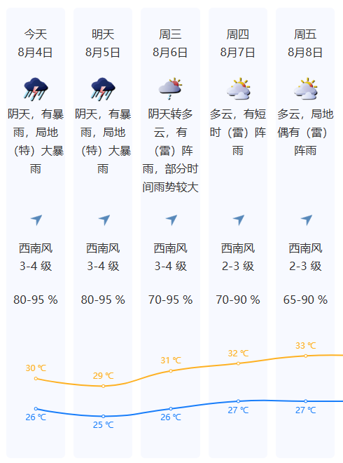 ·3日夜间至5日:阴天,降雨进一步加大,有大暴雨,局地特大暴雨的风险;
