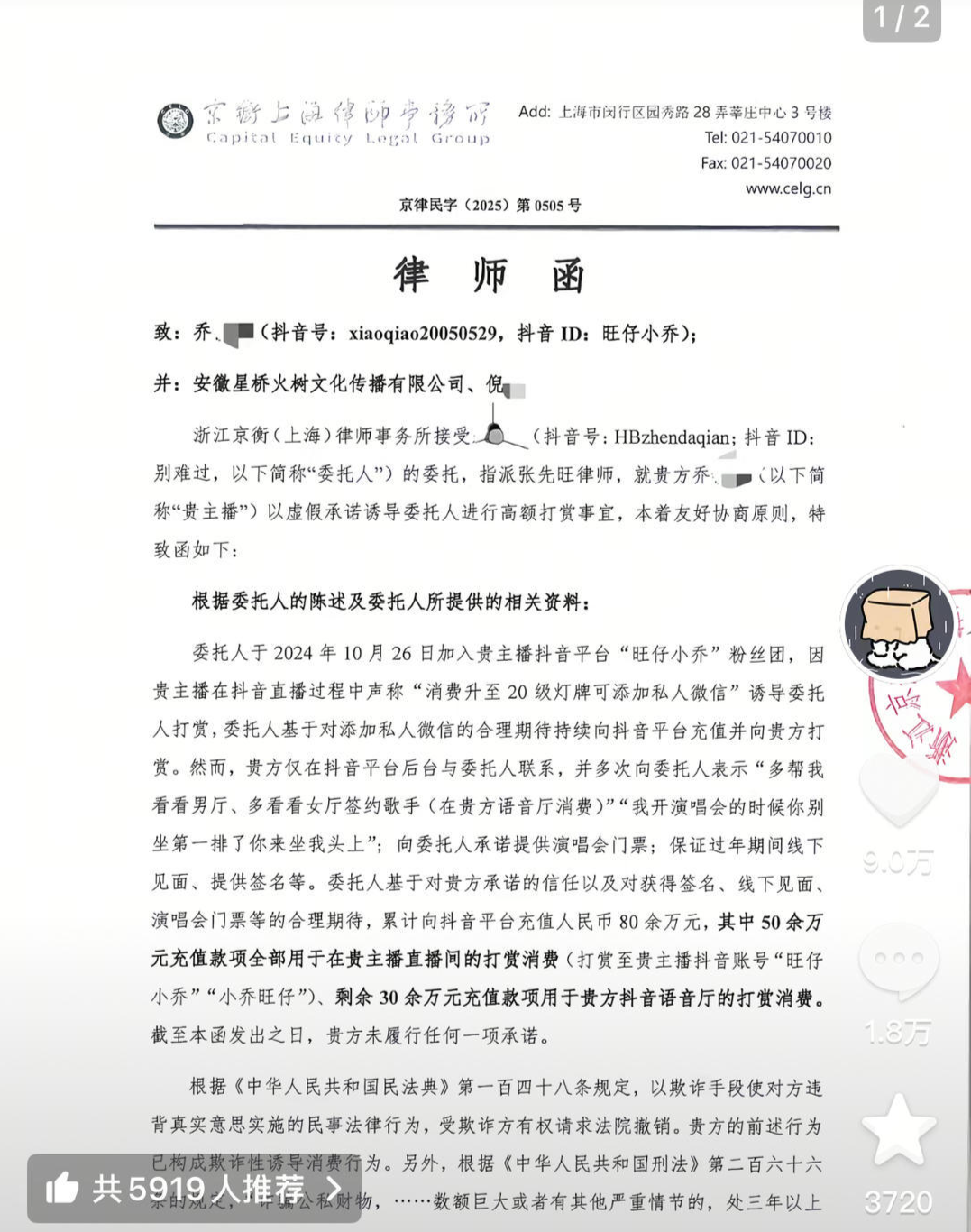 律师函称,以欺诈手段使对方违背真实意思实施的民事法律行为,受欺诈方有权请求法院撤销。“旺仔小乔”方的前述行为已构成欺诈性诱导消费行为。要求旺仔小乔方立即向“别难过”全额返还充值打赏款项;立即停止以虚假承诺诱导用户打赏的行为;于律师函送达之日起5日内与律师取得联系。如“旺仔小乔”方不履行上述义务也未回复律师函,“别难过”将委托律师通过司法程序追究法律责任,有权通过包括民事诉讼、刑事控告在内的法律途径依法维护合法权益。