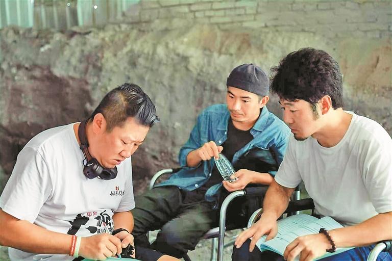 电影《大项目》拍摄期间,付天君和演员讨论剧情。