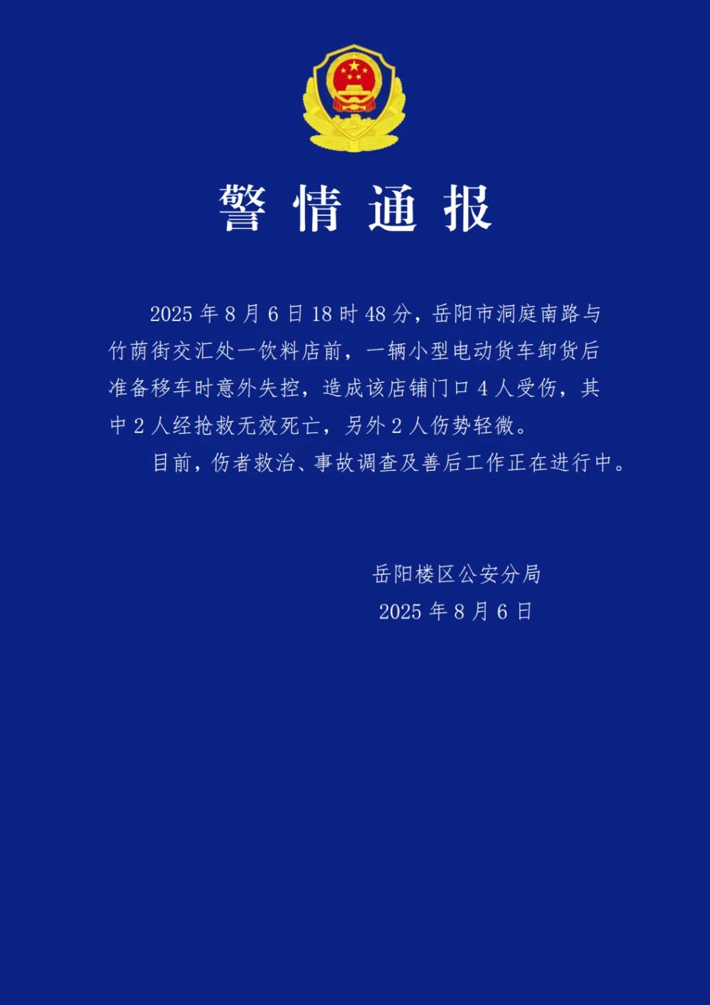 8月6日晚间,湖南岳阳公安发布警情通报:2025年8月6日18时48分,岳阳市洞庭南路与竹荫街交汇处一饮料店前,一辆小型电动货车卸货后准备移车时意外失控,造成该店铺门口4人受伤,其中2人经抢救无效死亡,另外2人伤势轻微。