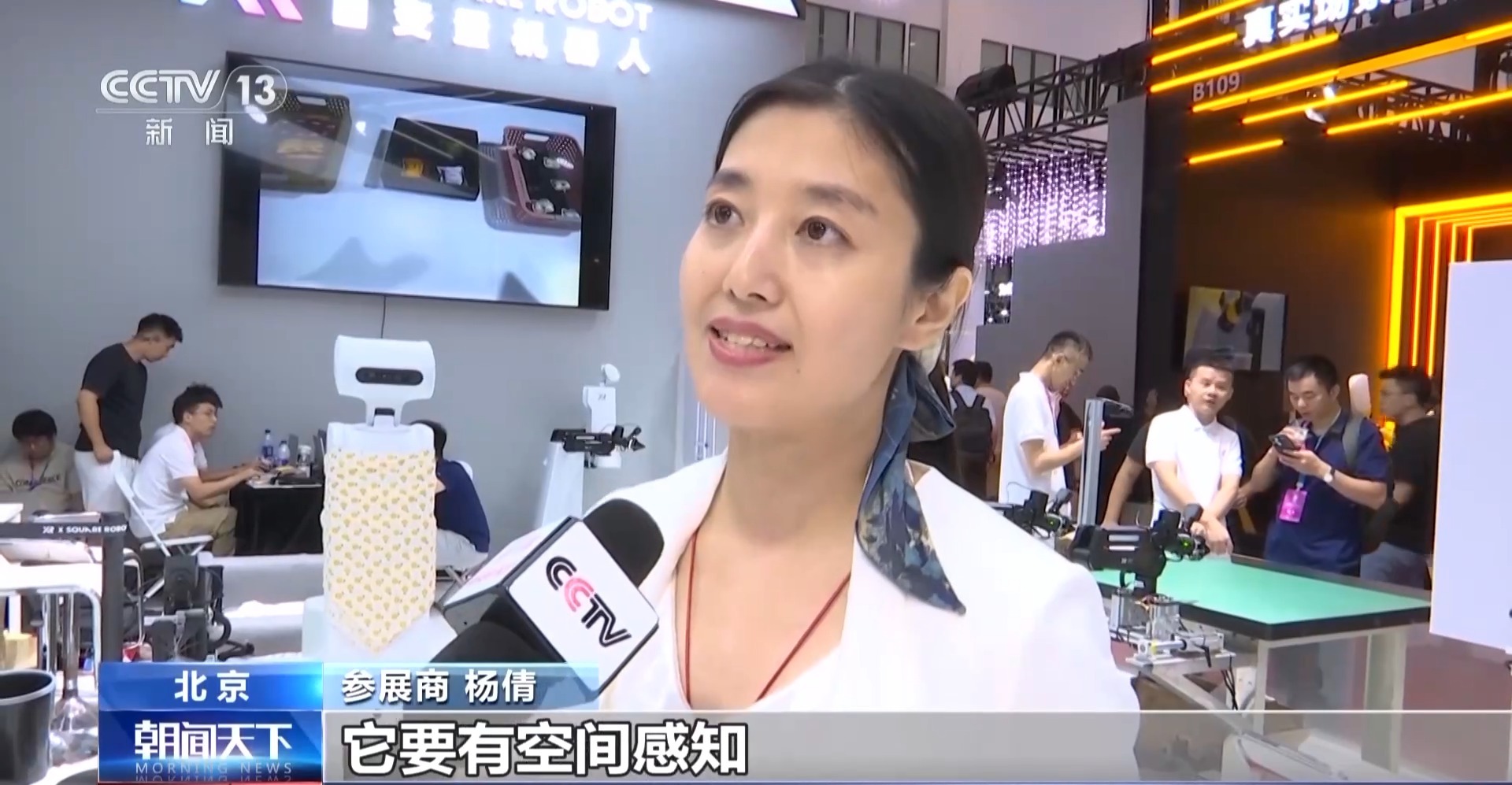 参展商 杨倩:它要适应物理空间的各种变化,它要有空间感知,要能知道什么叫摩擦,什么叫重力。同时它跟数据的结合更加地紧密,也就是说模型数据和硬件未来都是三位一体去做相应的迭代。