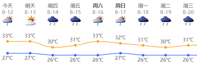 深圳今日多云间晴天,有短时(雷)阵雨;气温27-33℃;南风2-3级;相对湿度65%-95%。