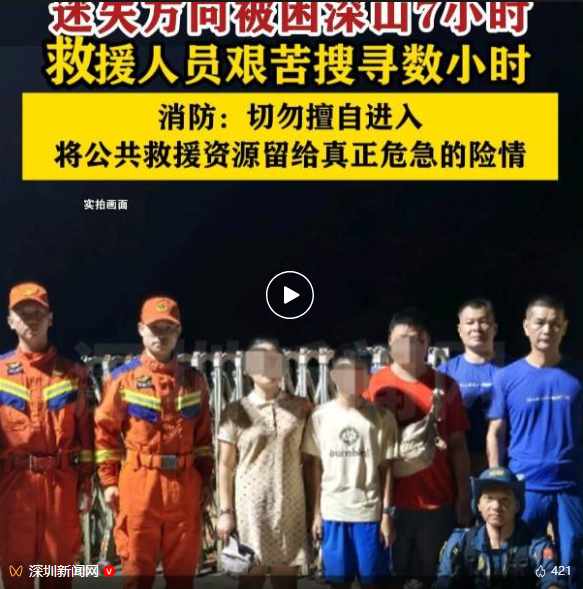 8月9日,深圳一家三口在罗浮山未开放区域迷路,被困深山7个小时。