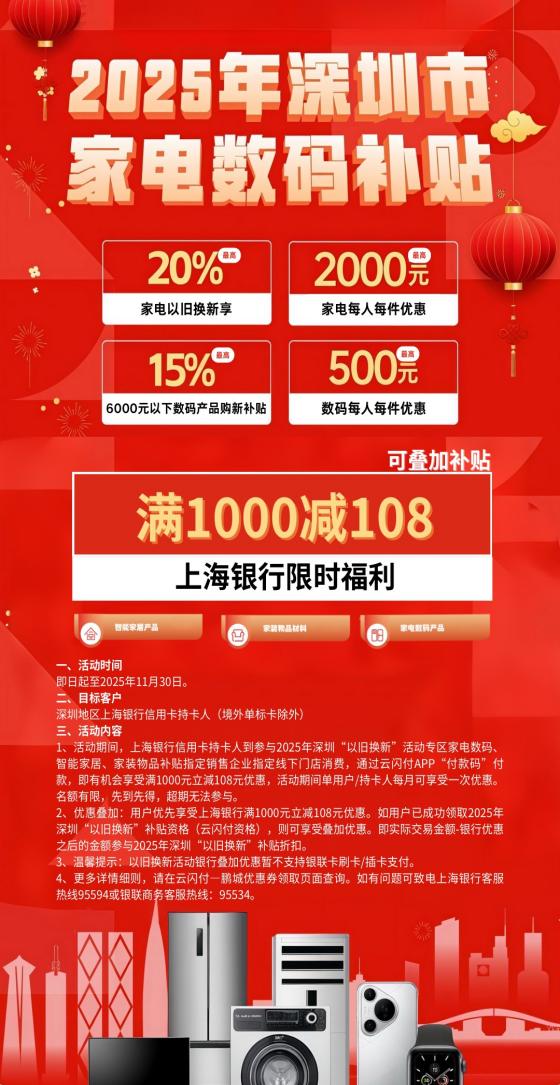 深圳新闻网2025年8月12日讯(记者 朱琳 通讯员 余瑜)上海银行深圳分行持续为客户带来金融服务与政策红利叠加的惊喜。目前上海银行深圳分行成为第一家开展深圳市国补叠加优惠的城商行。即日起至2025年11月30日,持上海银行信用卡在深圳指定国补门店消费,单笔满1000元即可立减108元,轻松实现“国补+银补”双优惠,让您的购物体验更超值。