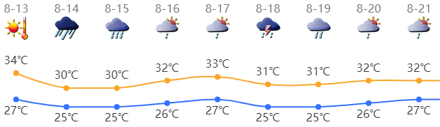 深圳今日多云,天气炎热,午后至上半夜有雷阵雨,并伴有8-9级短时大风;气温27-34℃,北部和人口密集区最高气温35°C或以上;西南风2-3级;相对湿度55%-95%。