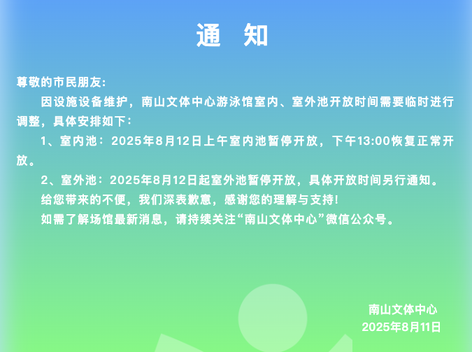 ● 南山:南山文体中心发布通知:因设施设备维护,南山文体中心游泳馆室内、室外池8月12日起暂停开放,具体开放时间另行通知。