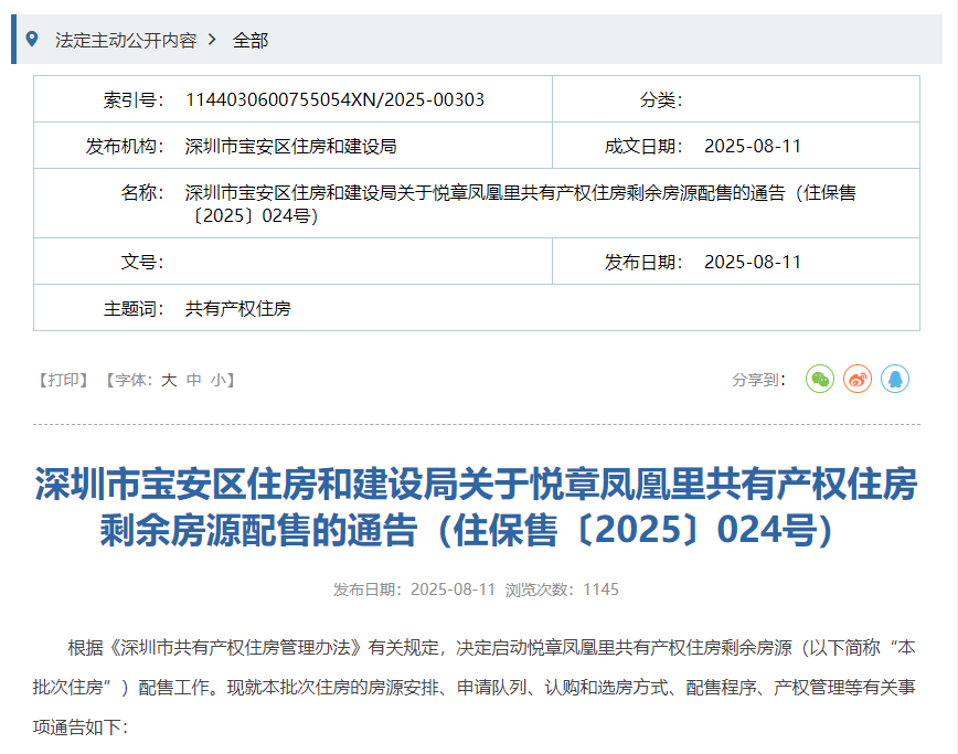 ● 宝安:新一批共有产权房悦章凤凰里8月12日开始申购(线上申请认购时间为8月12日9:00至8月15日18:00)。