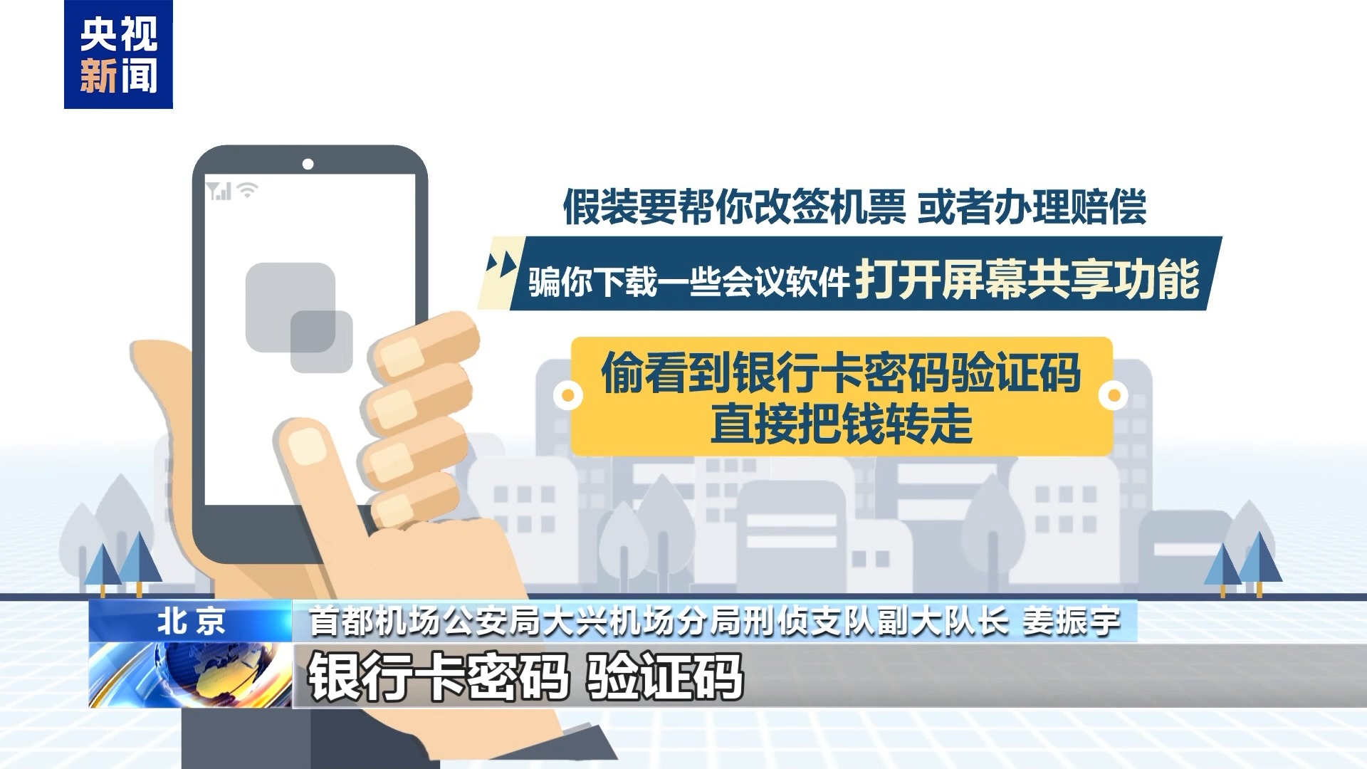 骗子假装要帮你改签机票,或者办理赔偿,骗你下载一些会议软件,让你打开屏幕共享功能,这样他们就能偷看到你输入的银行卡密码验证码,直接把钱转走。