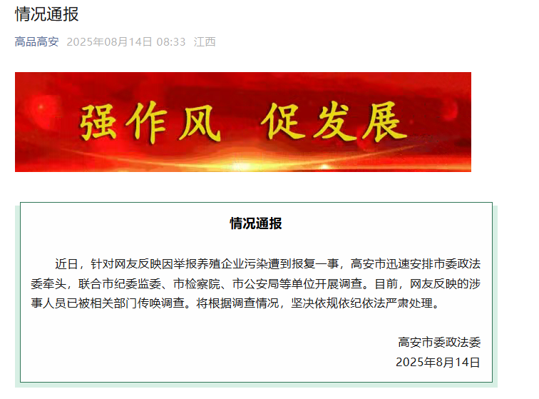 近日,针对网友反映因举报养殖企业污染遭到报复一事,高安市迅速安排市委政法委牵头,联合市纪委监委、市检察院、市公安局等单位开展调查。目前,网友反映的涉事人员已被相关部门传唤调查。将根据调查情况,坚决依规依纪依法严肃处理。