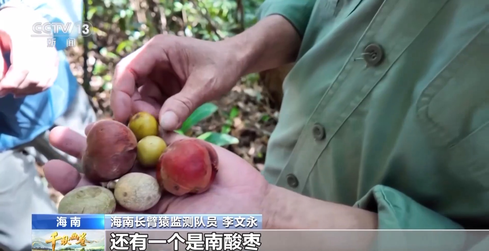 海南长臂猿监测队员 李文永:这个是大花五桠果,还有一个是南酸枣,这个是罗志藤,长臂猿最爱吃的果树,到成熟了长臂猿就过来吃。
