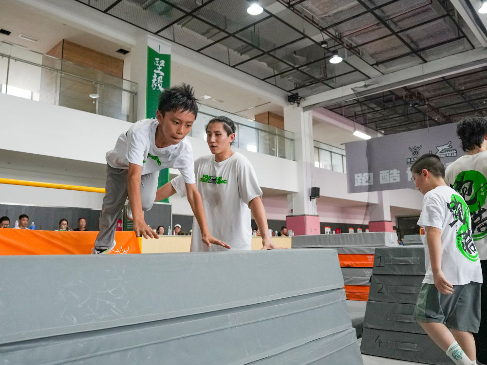 8月5日,在成都一家跑酷训练基地,小朋友在练习跑酷。新华社记者 王曦 摄