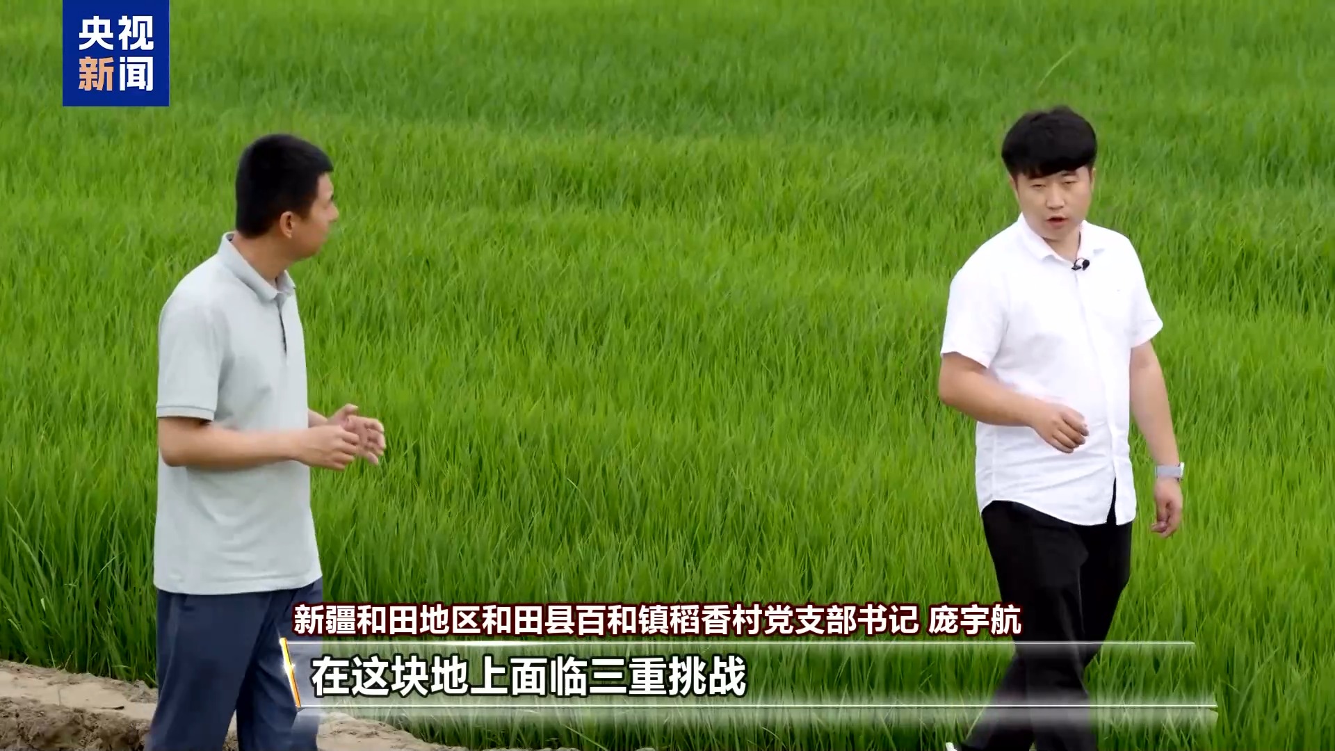 新疆和田地区和田县百和镇稻香村党支部书记 庞宇航:在这块地上面临三重挑战,沙荒、土碱、水缺。针对这三个问题,农学院专家、当地农民,还有我们干部组建了改土治水攻坚小组。完了又集中整合土地,最后就是我们的选种,才打造出来现在我们看到的万亩稻田。