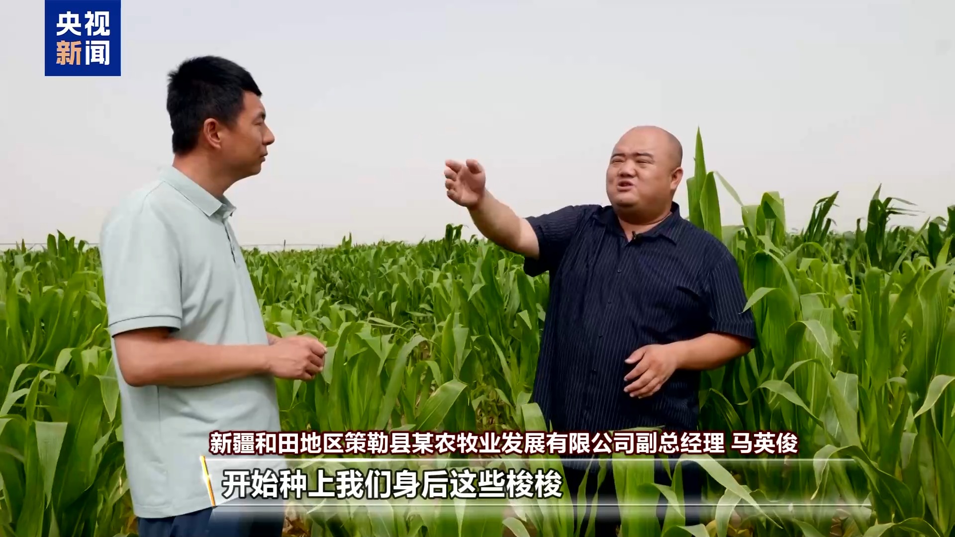 新疆和田策勒县某农牧业发展有限公司副总经理 马英俊:在玉米地周边种上梭梭、红柳这些树以后,我们今年玉米的长势还是比较乐观的。