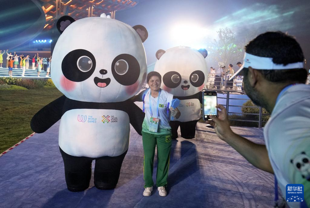 8月17日,运动员在闭幕式上与本届世运会吉祥物“蜀宝”合影。