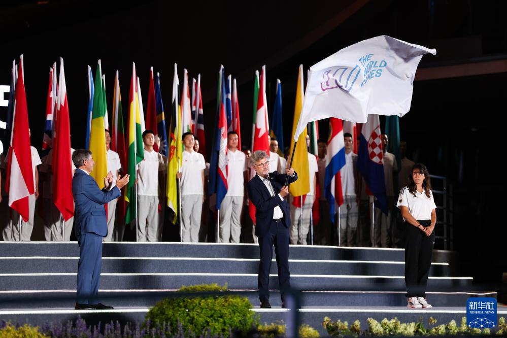 这是8月17日在闭幕式上拍摄的国际世界运动会协会会旗交接仪式。