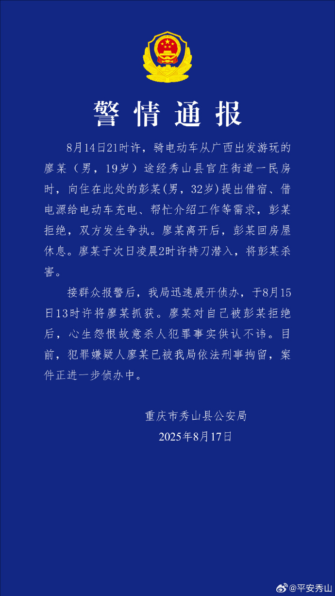 据重庆市秀山县公安局,8月14日21时许,骑电动车从广西出发游玩的廖某(男,19岁)途经秀山县官庄街道一民房时,向住在此处的彭某(男,32岁)提出借宿、借电源给电动车充电、帮忙介绍工作等需求,彭某拒绝,双方发生争执。廖某离开后,彭某回房屋休息。廖某于次日凌晨2时许持刀潜入,将彭某杀害。