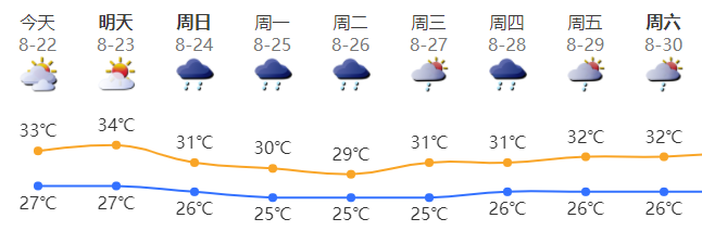 预计22-23晴天间多云,局部有短时阵雨,天气炎热,22日气温27-33℃;