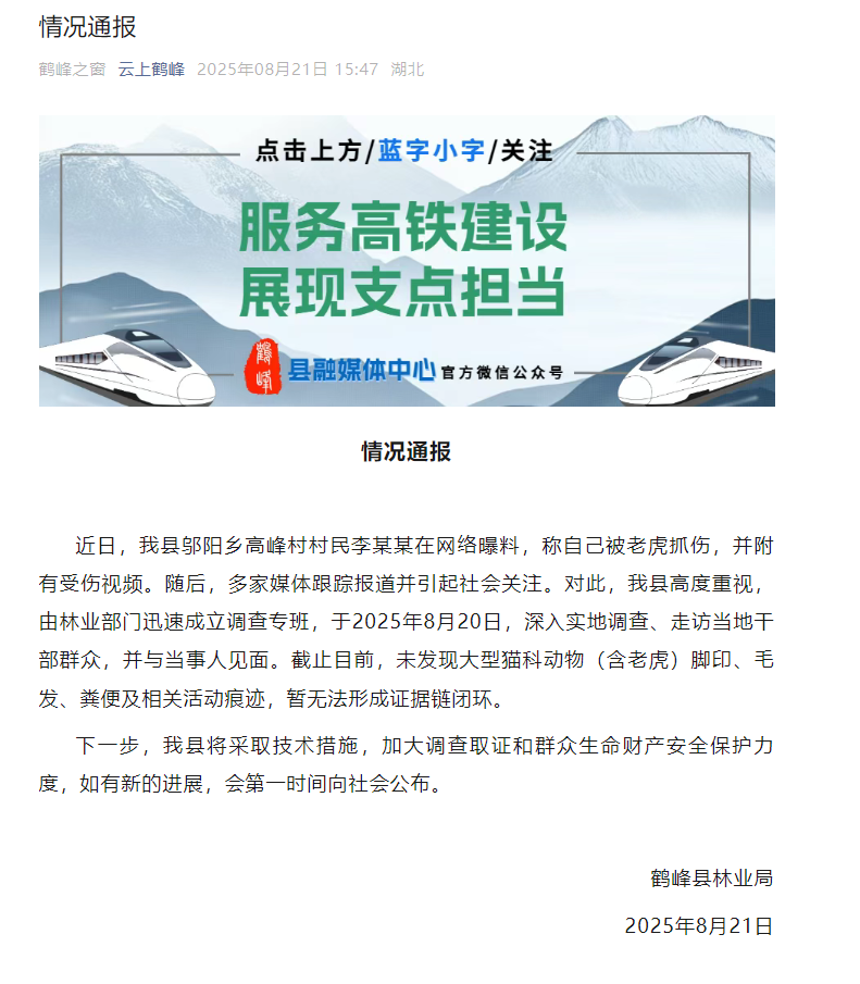 ● 湖北鹤峰一村民称被“老虎”袭击,官方通报:暂未发现大型猫科动物活动痕迹。