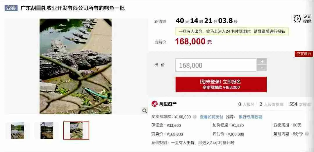 ● 据阿里资产•司法平台,广东2500斤鳄鱼被拍卖,法院:需“上门自提”。