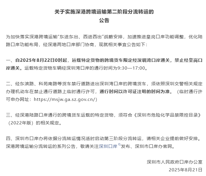 ● 深圳市人民政府口岸办公室发布关于实施深港跨境运输第二阶段分流转运的公告。