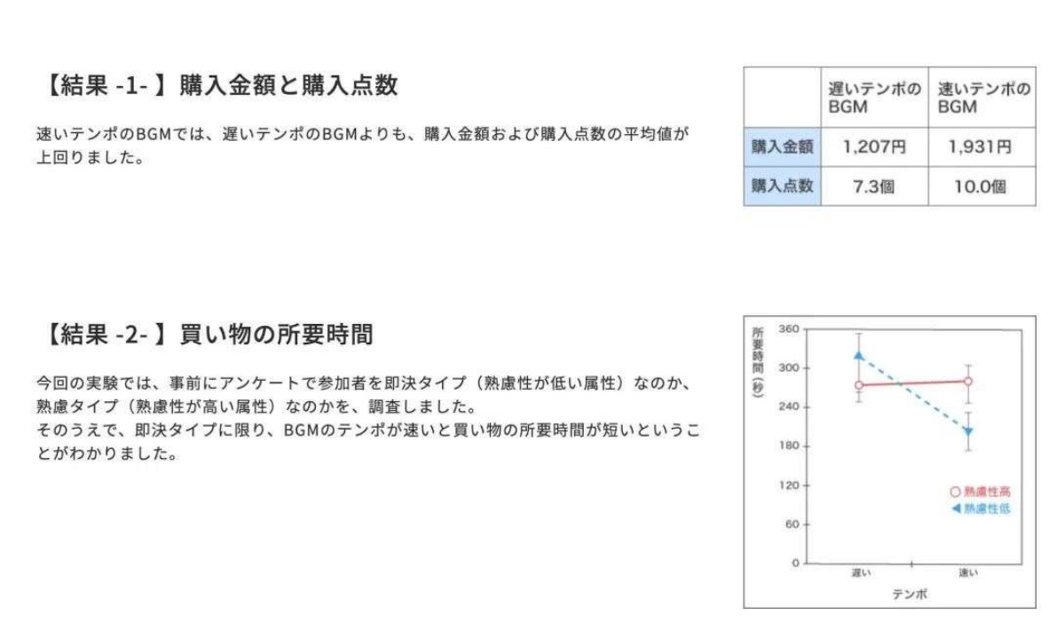同样,日本背景音乐服务商USEN也进行了一项实验,探究BGM节奏对购物行为的影响。他们让两组顾客在便利店分别听快节奏和慢节奏音乐购物。结果显示,快节奏音乐让顾客花费更多、购买数量更多,但购物时间更短;慢节奏音乐则让顾客更放松。因此,商家应根据店铺的具体经营状况来选择合适的背景音乐节奏。