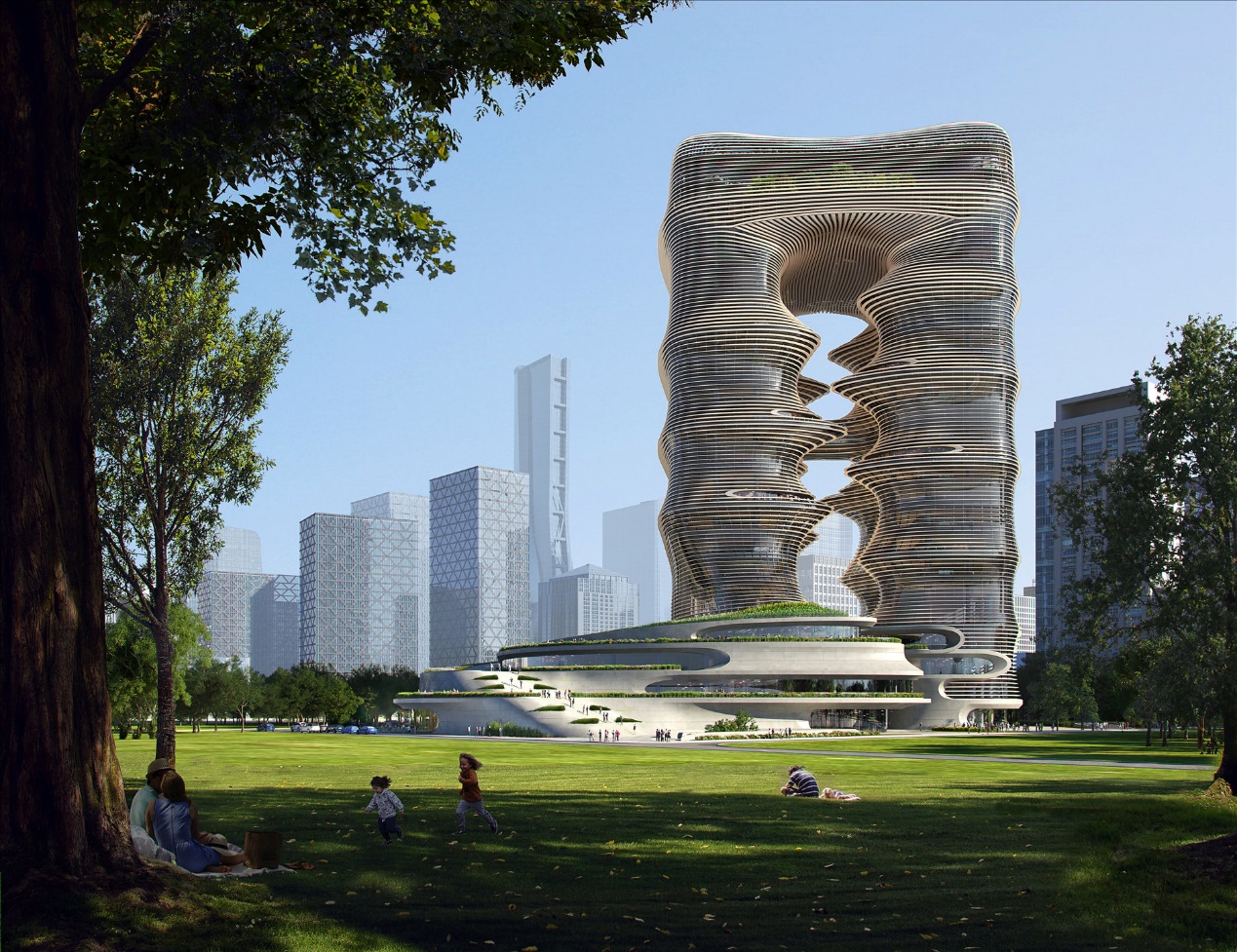 从目前呈现的建筑楼体形态,亦可直观感受到“峡谷”的流动感。设计团队巧妙地将自然峡谷的立体形态与流动特质融入建筑中,通过空中连体巨构、公共坡道以及退台花园等,打造出上下错落、内外通达的多层次立体空间结构。