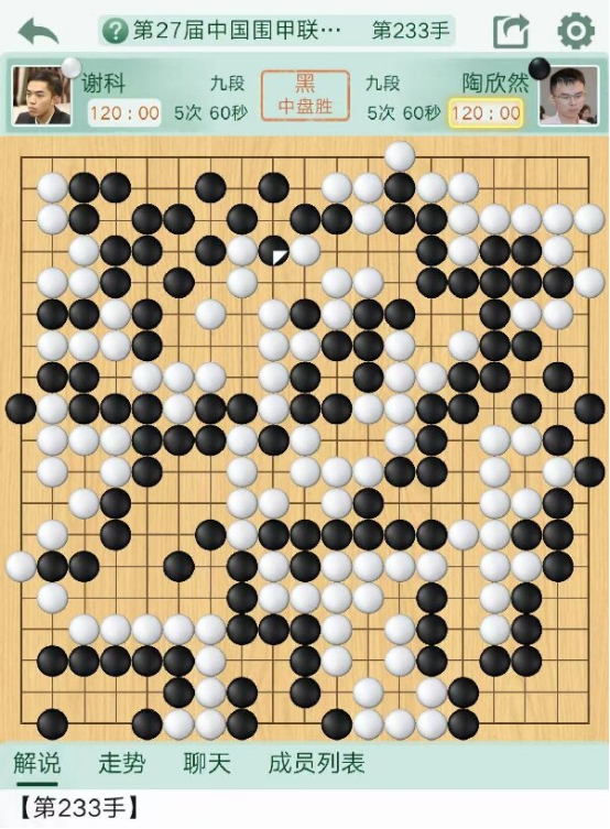 二台,陶欣然执黑战胜苏泊尔杭州队谢科,赢下深圳队本轮唯一胜局。开局谢科优势,但第82手白棋突发奇想,意图将右边白棋大龙弃掉转换。中途谢科发现转换的话白棋要输,又改为寻求大龙做活,陶欣然黑棋放白活棋并将白棋左边大空打穿,收获一盘大胜。