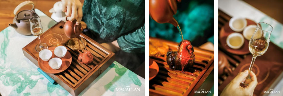 为礼赞新品,麦卡伦特别打造“茶-威士忌”专属品鉴仪式,溯源中国工夫茶道精髓。嘉宾首先在品牌大使的引导下,品鉴经六小时慢萃而成的蜜兰香冷泡茶,感受其清雅芝兰香,体验由凉转温的口感层次。 随后茶艺师登场,娴熟展现潮汕工夫茶艺精髓——温器、滚杯、冲泡,以沸水唤醒凤凰单丛,顷刻茶香四溢,茶席间陈设的骏马茶宠遇热后釉色变为暖红色,为仪式增添一抹东方美学的灵动色彩。品牌大使引导来宾品鉴“臻味不凡系列·凤凰茶语”,茶韵与桃杏果香交织于舌尖,呈现东西方风味碰撞的丰饶层次。整个仪式不仅致敬了东方茶文化的共享哲思,也彰显了麦卡伦一贯的匠心与创新精神。