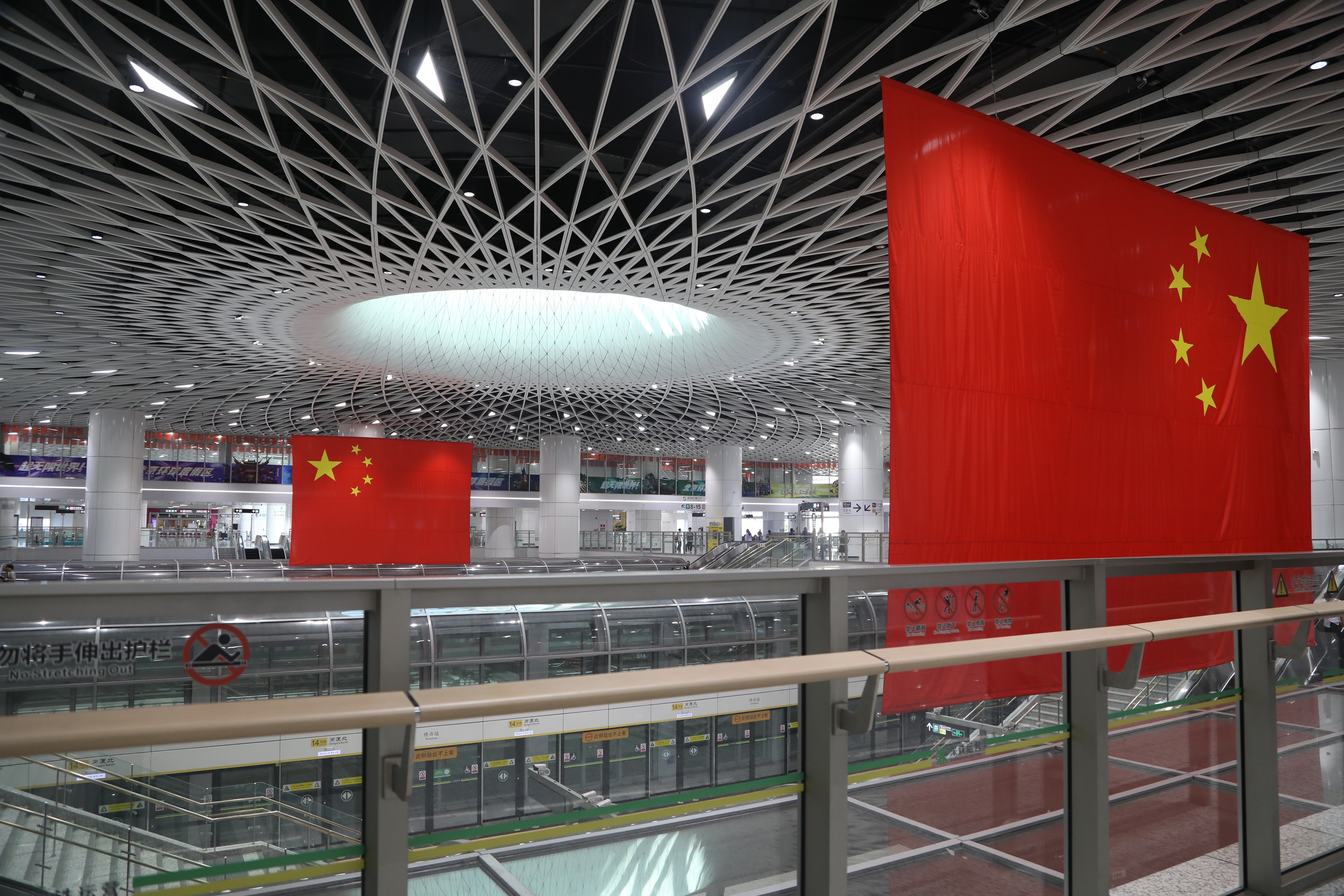9月2日,深圳岗厦北地铁站挂上了两面巨幅五星红旗,营造浓浓的节日气氛。据深圳地铁,国旗将悬挂至国庆节后,主要集中在换乘公共区域。其中岗厦北、黄木岗、大运枢纽悬挂尺寸为9*6米的大型国旗。