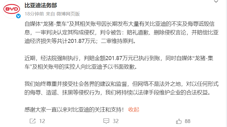 ● 比亚迪回应遭自媒体侮辱诋毁:“龙猪-集车”被判赔201.87万元,实控人向比亚迪予以书面致歉。
