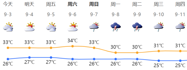 深圳今日多云间晴天,局地有(雷)阵雨;气温26-33℃,中北部及人口密集区最高气温再高1-2℃;东南风2-3级;相对湿度55%-90%。