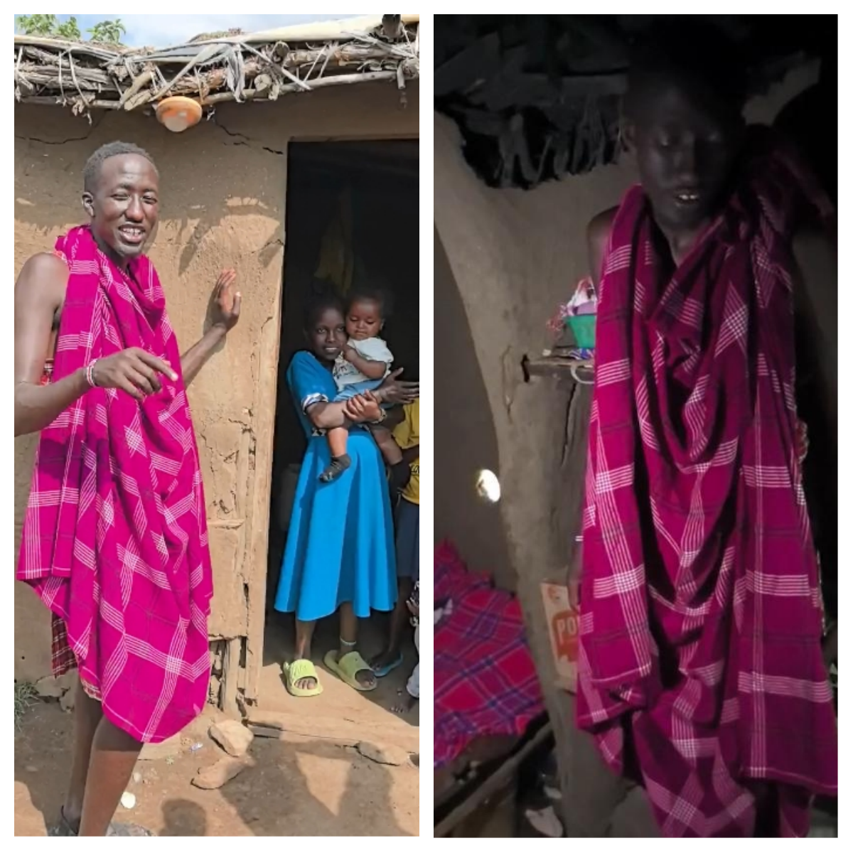 马赛村被两道围栏环抱:外圈荆枝高墙用来防御野兽,内圈木栅栏则圈养牲畜。房屋由妇女建造,用泥土、树枝和牛粪夯成,坚固却低矮,室内没有窗户,光线昏暗,只靠杯口大的小洞通风透光。丹尼尔带我们参观家中,一张大床是夫妻的,一张小床留给孩子,厨房的火坑旁摆着一盒茶杯——是妻子为来访邻居准备的。马赛人依旧保留着饮牛血、食生肉的习俗,他们相信牛血能赋予力量。在缺乏现代医疗的情况下,草药疗法和祖传经验依旧是他们对抗疾病的主要方式。