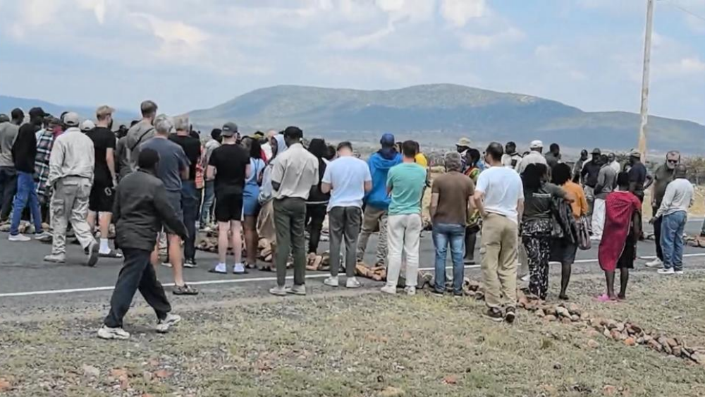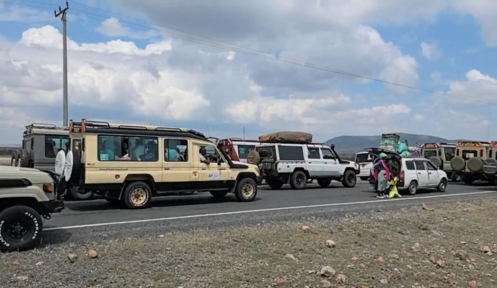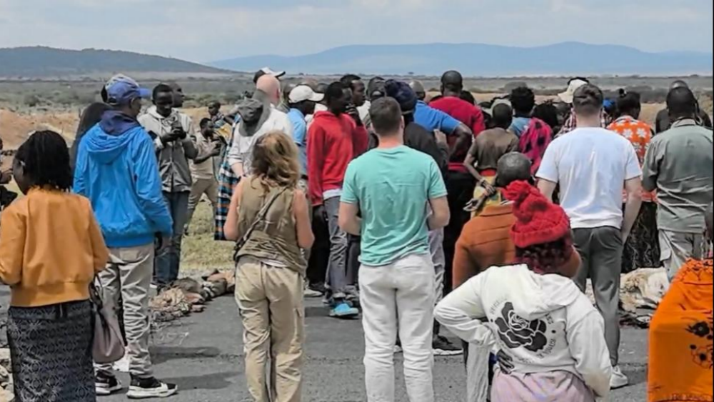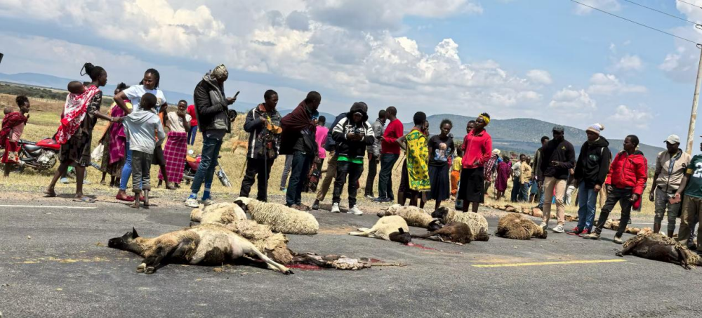 离开纳瓦沙,柏油公路一路平坦,沿途是大片收割的玉米农田与零星小镇、村落。车窗外,孩子们在尘土飞扬的小道上追逐,一旁的妇女头顶水罐稳步前行,勾勒出一幅生动的乡村画卷。行驶约四小时,距离酒店还有一小时车程时,车队忽然停下。前方三十多辆越野车一动不动,原来有人驾驶的车辆撞死了马赛人放牧的10只羊,肇事车已经逃匿。C12公路被石块封住,路中央一片狼藉,羊的尸体,惨不忍睹,周围站着数百名马赛人和2名交警论理索赔。羊在马赛社会中不仅是经济资产,每只羊值150美元,更是家庭与身份的延续,是彩礼、祭祀乃至日常生活的依靠。因此,这类交通事故往往演变为拦路索赔的社会事件。我们现场看到,多辆越野车的司机与警察沟通,最终商定每车交1000先令,约55.6元人民币,由警方转交给羊主人作为补偿。半小时后,石块被挪开,车队缓缓启动。这一幕,让我们直面草原社会与现代交通规则的碰撞,也感受到传统与现代交织的复杂现实。