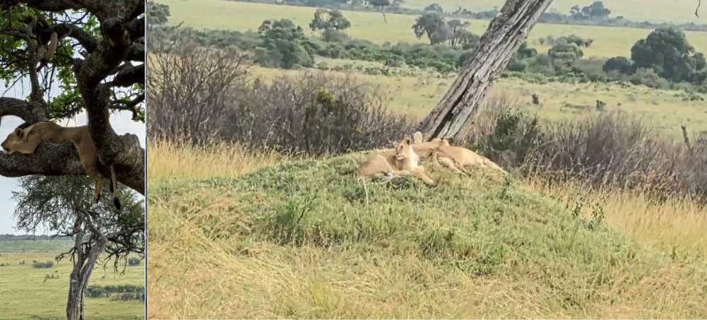 傍晚时分,我们进入保护区Safari,开启两小时的草原探访。首先映入眼帘的是一群狮子,慵懒地散落在草地上。其中一只狮子竟然爬上了高大的香肠树,四肢自然垂下,趴在枝干上半眯着眼,享受着晚风的轻拂。狮子能爬树并不常见,这一幕让我们屏住呼吸,好像在看一场独属非洲的奇观。其余几头雄狮与母狮则三三两两卧在草丛间,偶尔抬头巡视,更多时候只是安静地呼吸。