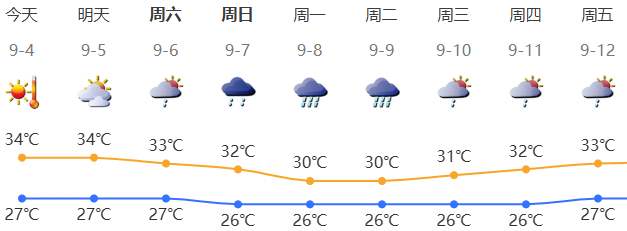 深圳今日多云间晴天,局地有短时(雷)阵雨;气温27-34℃,中北部和人口密集区最高气温可达35-37℃;东南风2-3级;相对湿度55%-90%。