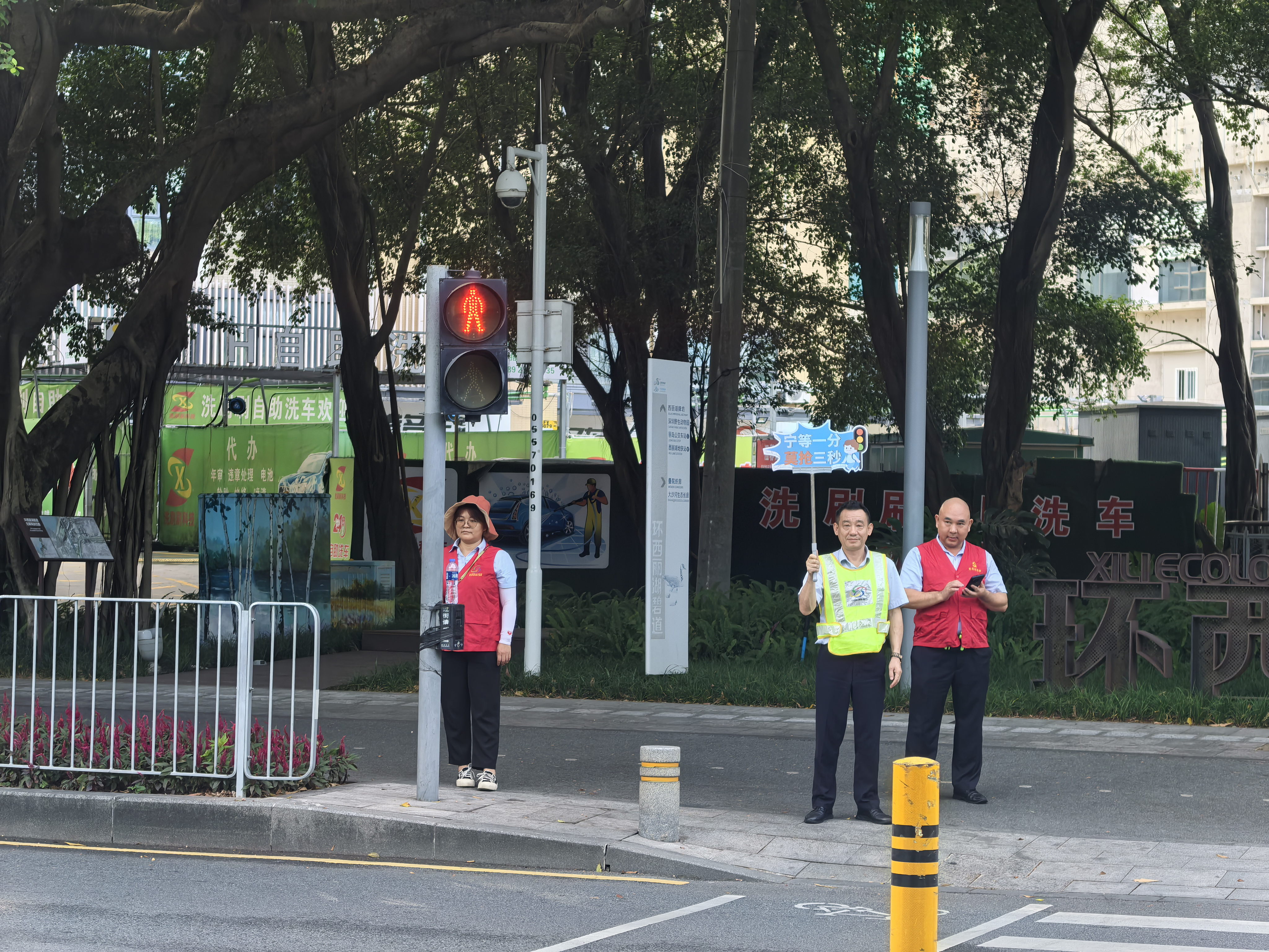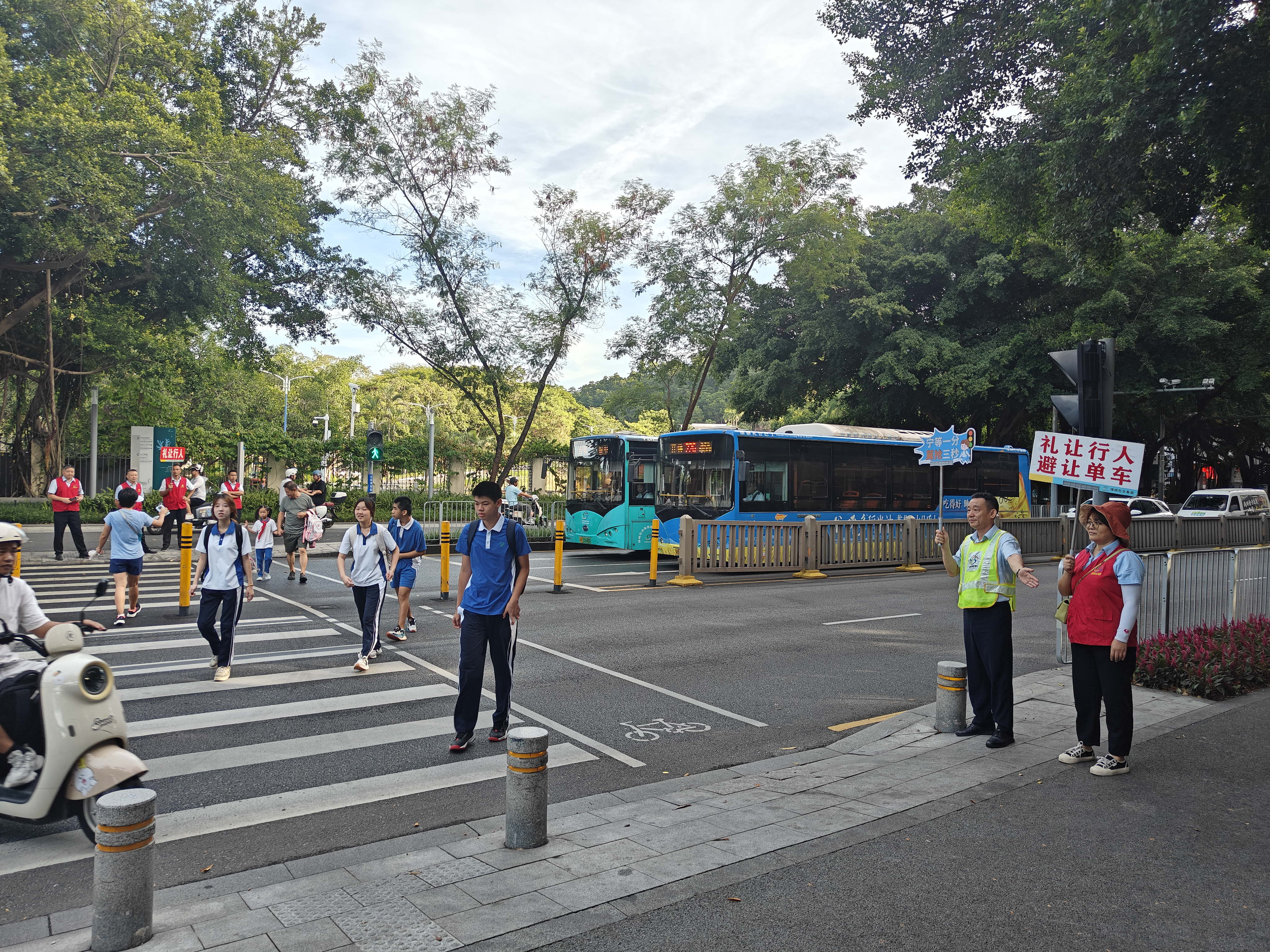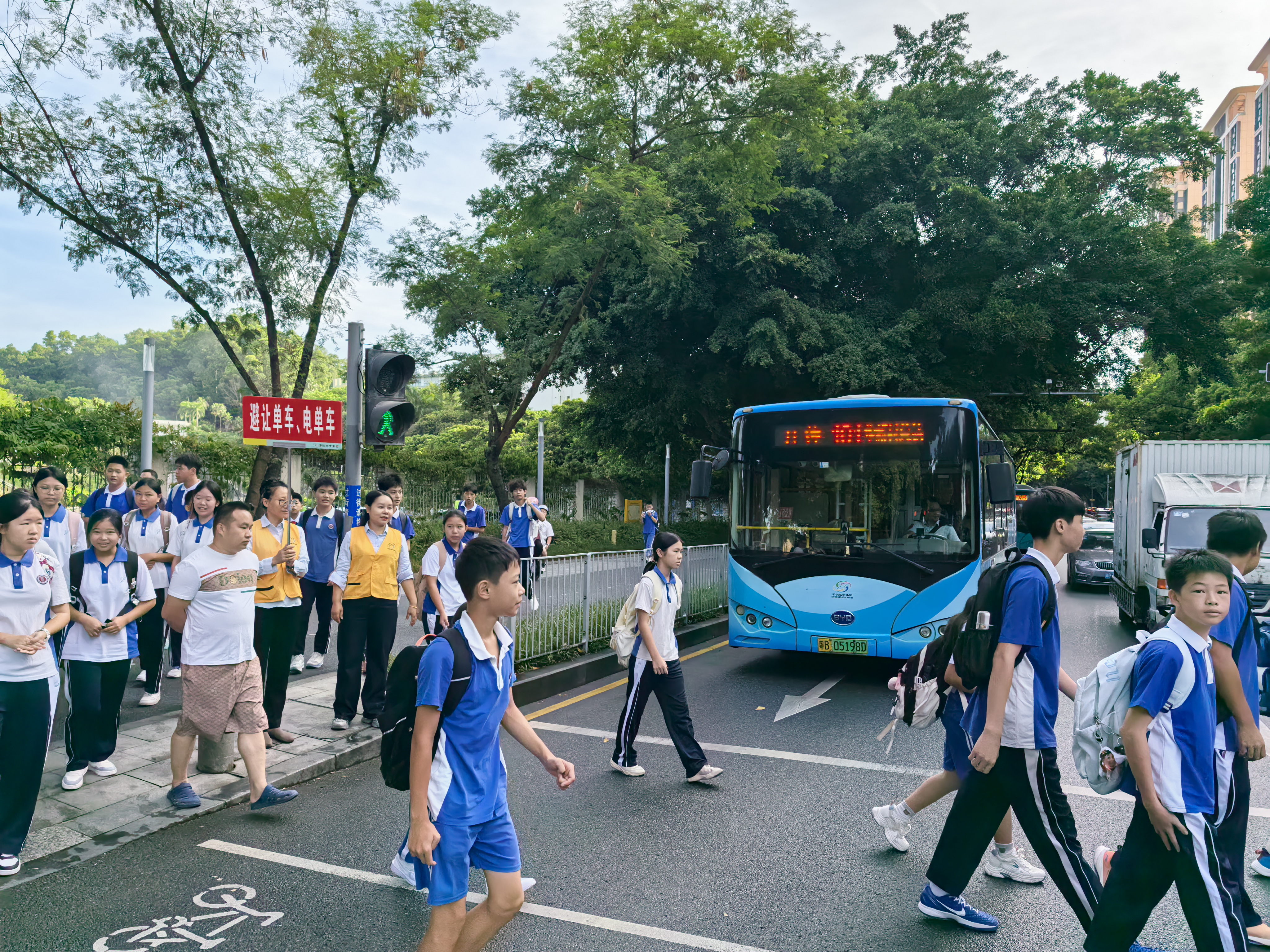 9月1日清晨7时,开学早高峰如期而至。在丽湖学校门口路段,身着醒目黄马甲的工作人员已提前到岗,分散在车流、人流密集的关键节点开展疏导工作。他们手持“避让单车、电单车”“宁等一分,莫抢三秒”的温馨提示牌,一边示意过往车辆减速礼让,一边有序引导学生分批通过斑马线。在工作人员的守护下,学子们安全通行,现场交通秩序井然,贴心的护学服务赢得了家长们的一致称赞。