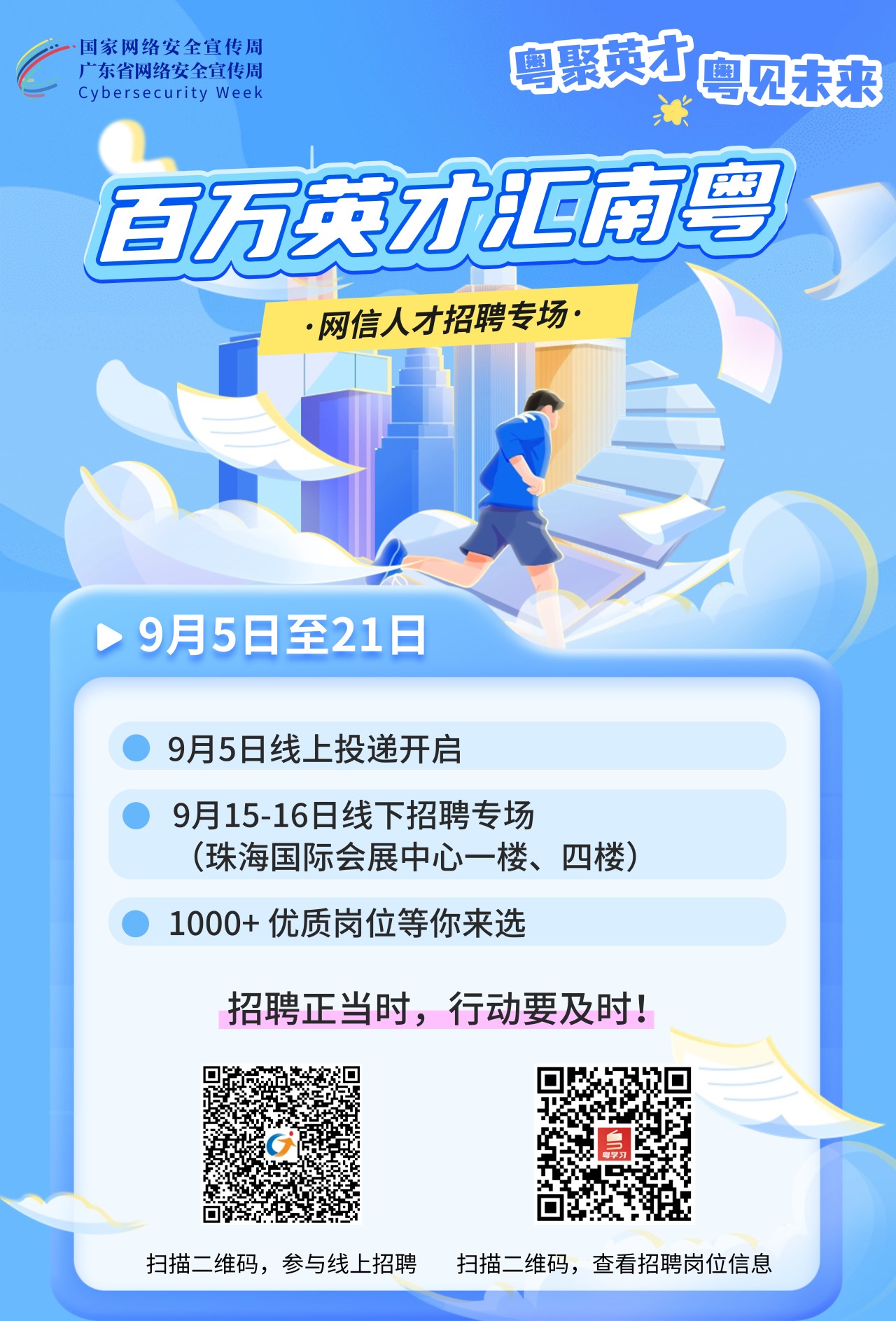 为积极落实“百万英才汇南粤”行动计划,用好网络安全宣传周平台,吸引更多优质网信企业、网信人才来粤创业就业,9月15日至16日,省委人才办、省委网信办、省人力资源和社会保障厅在广东省网络安全宣传周主会场(珠海国际会展中心)联合举办“百万英才汇南粤”网信人才招聘专场,并在网安周期间(9月5日至21日)同步举办线上招聘专场。