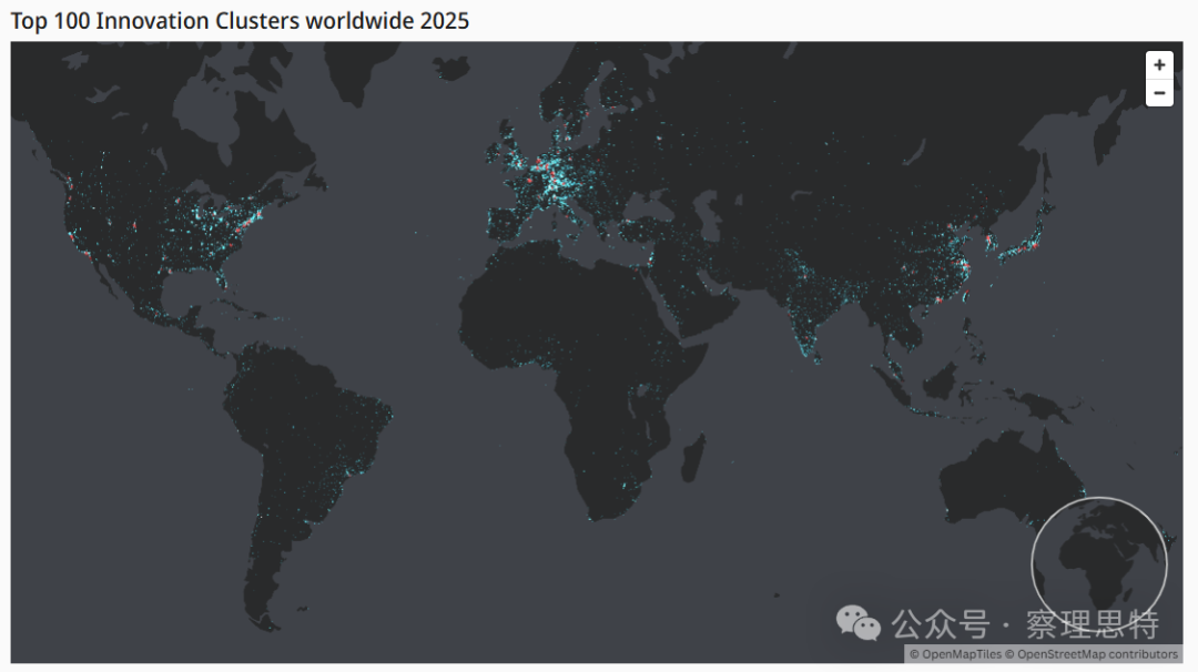 全球百强创新集群分布。(图片来源:WIPO统计数据库,2025年5月)