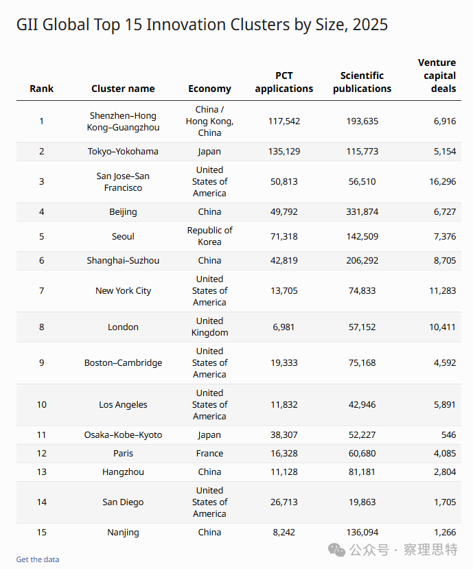 2025年世界百强创新集群前15名规模排名。(图片来源:WIPO)