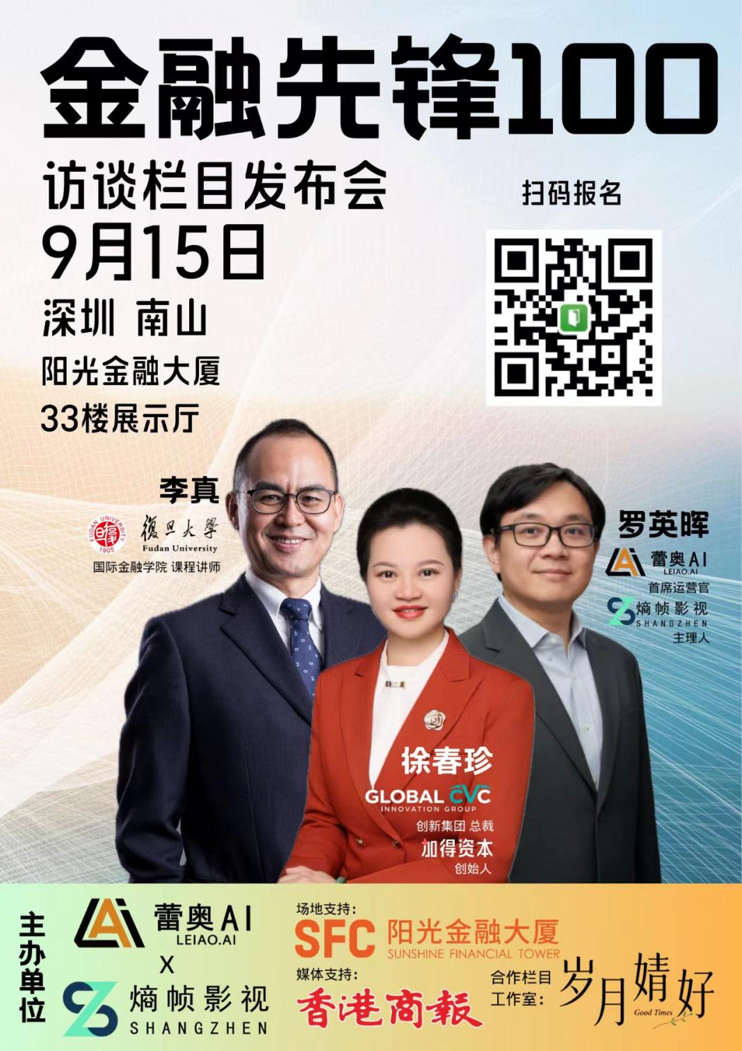 9月15日,由熵帧影视与蕾奥AI联合主办、香港商报作为独家媒体支持的《金融先锋100》访谈栏目发布会在深圳后海金融总部基地阳光金融大厦圆满举行。发布会由加得资本创始人徐春珍主持,金融界投融资代表、上市公司高管、科技产业青年创业者以及媒体嘉宾相聚一堂,高朋满座,跨界聚焦“金融先锋100”主题,大咖论剑。发布会旨在通过打造金融人的专属故事IP,利用AI扩大其传播的影响力,并强化了金融行业从业者的真实经历与闪光点值得被更多人关注。