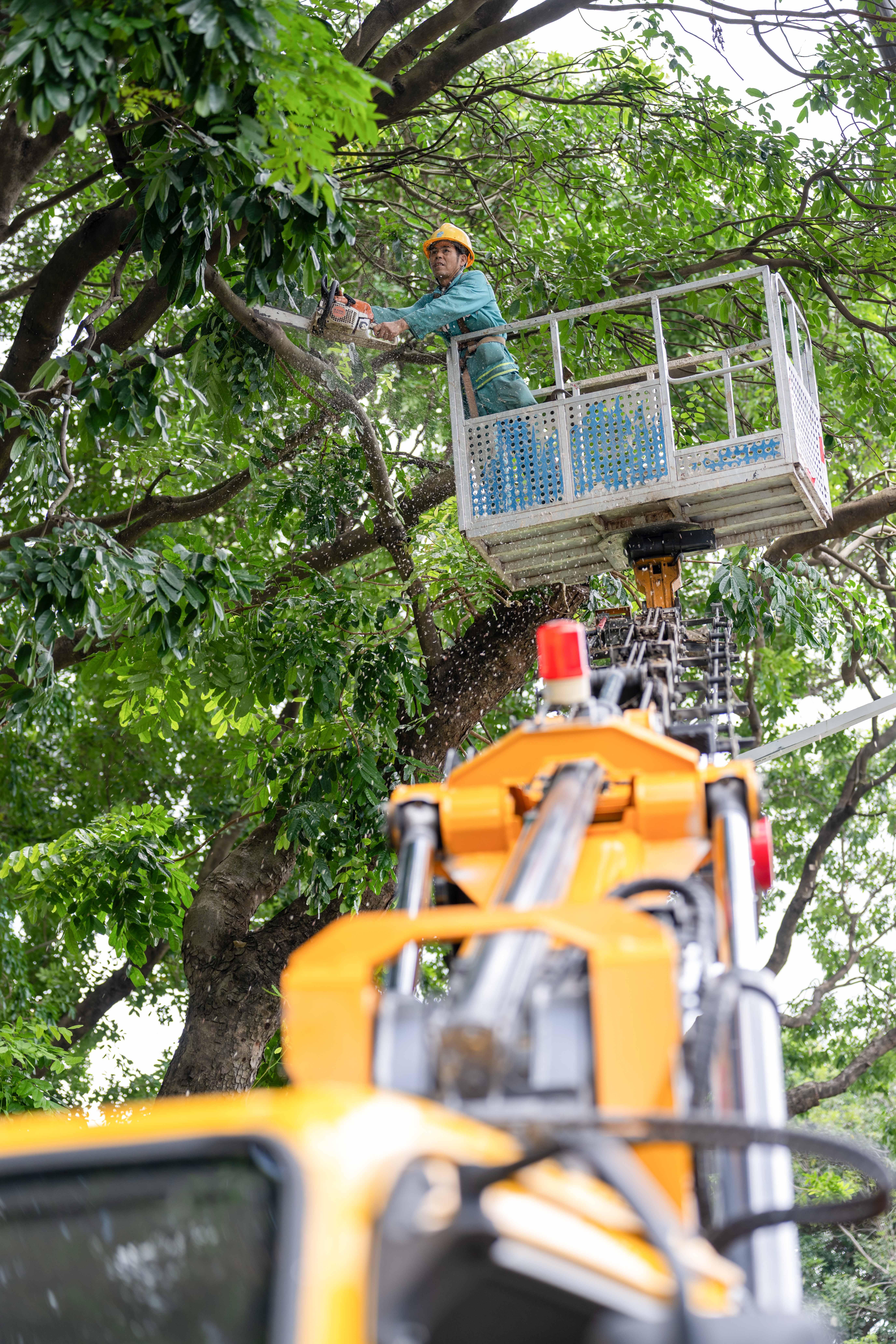 北环大道,绿化工人开展修剪工作。