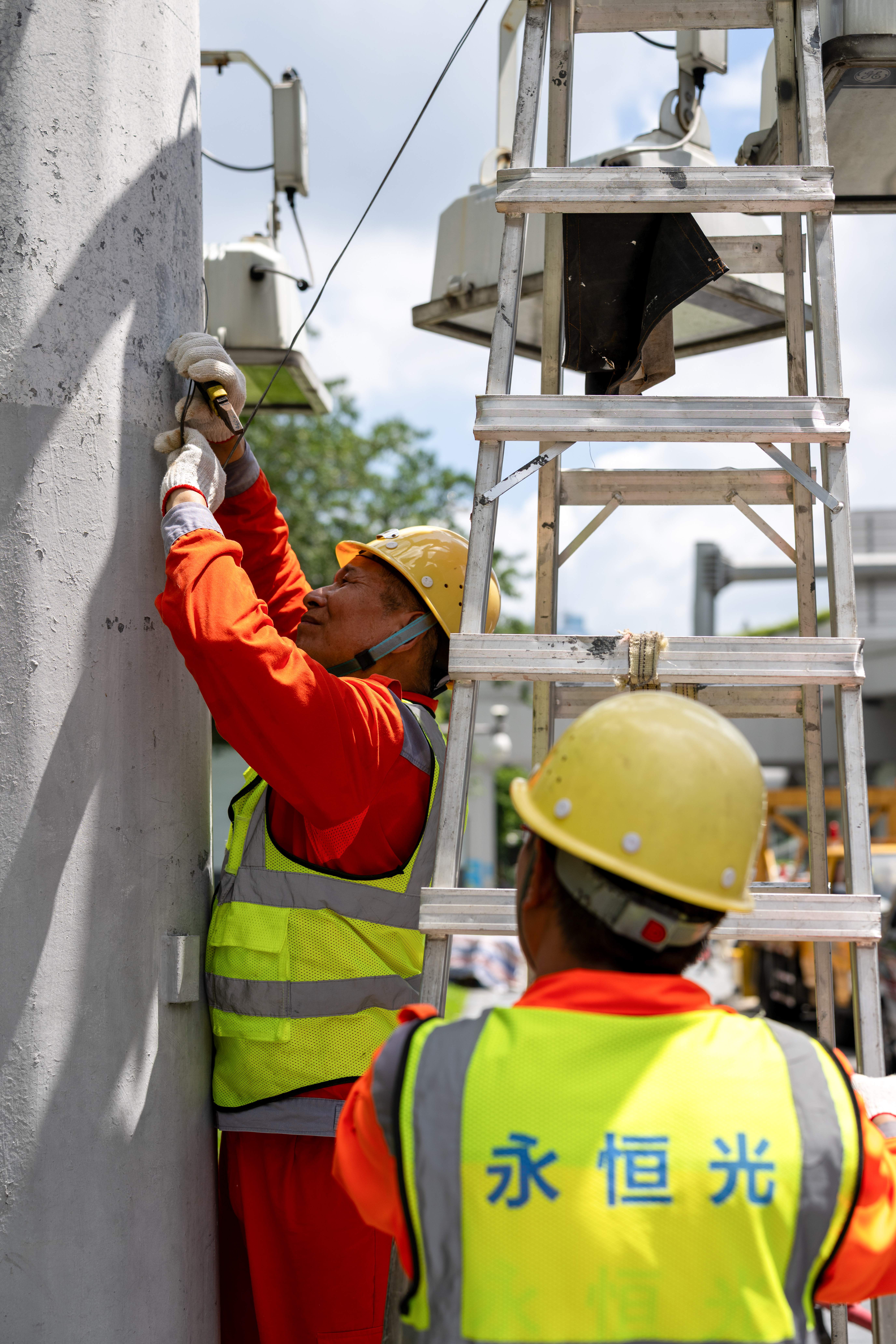 滨河大道,市容中心工作人员降下高杆灯并进行加固。